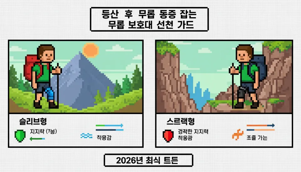 마지막으로 팁을 드리자면, 무릎 상태가 많이 좋지 않은 날에는 얇은 기능성 레깅스 위에 슬리브형을 착용하고, 그 위에 스트랩형을 덧대어 이중 보호를 하는 방법도 있습니다. 장비는 나를 돕는 도구일 뿐, 가장 중요한 것은 평소 스쿼트나 런지 같은 운동으로 허벅지 근육을 강화하는 것임을 잊지 마세요. 2026년에는 똑똑한 장비 선택으로 통증 없는 즐거운 산행 되시길 바랍니다.